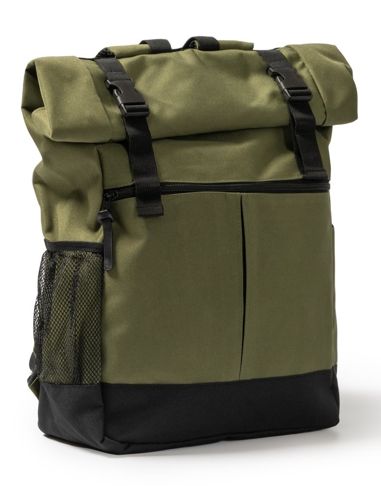 Multifunkciós hátizsák. 1. Dupla párnázatú vállszíj és speciális kézipánt. 2. Középső, kihúzható nyílás, automata behúzókkal és cipzárral. 3. Elülső cipzáras, füles zsebbel. 4. Oldalzsebek, egy állítható, hálós szövetből és egy alapszöveből. 5. Behúzható belső zseb.