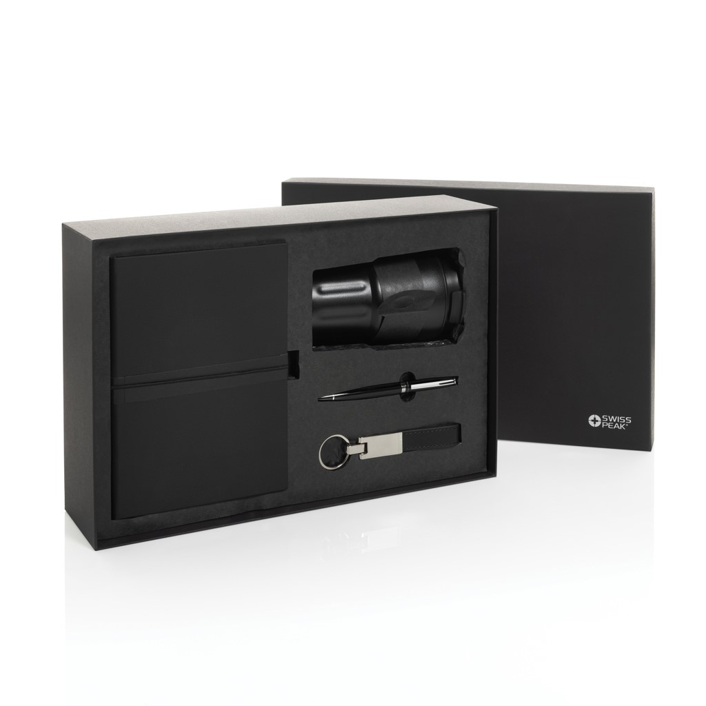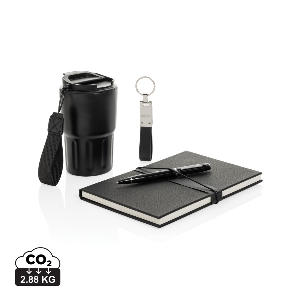 A készlet tartalmaz egy 350 ml-es dupla falú, vákuumszigetelésű poharat, amely hosszabb ideig melegen vagy hidegen tartja az italt. A szivárgásmentes fedél biztosítja, hogy a ruháid szárazak maradjanak, még akkor is, ha a pohár megdől vagy nincs függőlegesen tartva. A prémium Swiss Peak kulcstartó fényes fémes bevonattal és elegáns PU bőrszíjjal mindig kéznél tartja a legfontosabb kulcsaidat.
