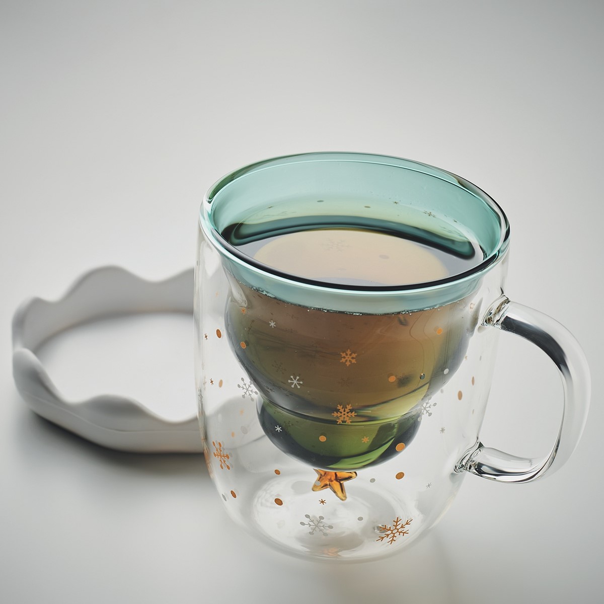 - Egy vidám, fejjel lefelé fordított karácsonyfát tartalmaz a bögrében